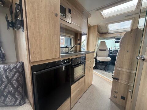 The fully equipped kitchen area includes a cooker, fridge freezer, sink, and solar panel, all supported by a Whale heating system – ideal for all-season adventures.