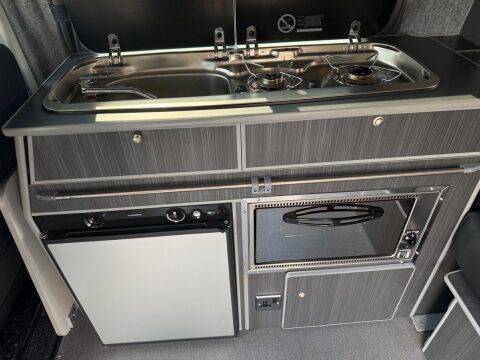 The Crusader campervan conversion layout offers plenty of space with a fitted kitchen set along the driver’s side of the van and two rear forward-facing seats. This then allows for a very large area at the rear of the van for storage. The Crusader is offered in a range of beautiful hand-crafted kitchens, perfectly finished and fully fitted with high spec kitchen appliances including a grill oven, a large 12V\mains fridge freezer, an integrated electric pumped sink with a two-burner hob on the opposite side. These are neatly covered by a split, hinged toughened glass lid when not in use. A microwave can also be fitted as an optional extra.