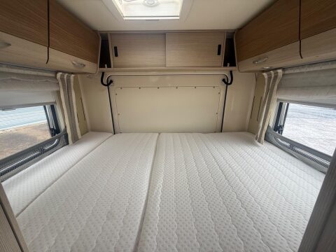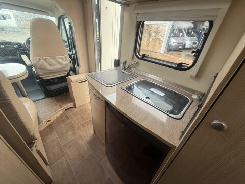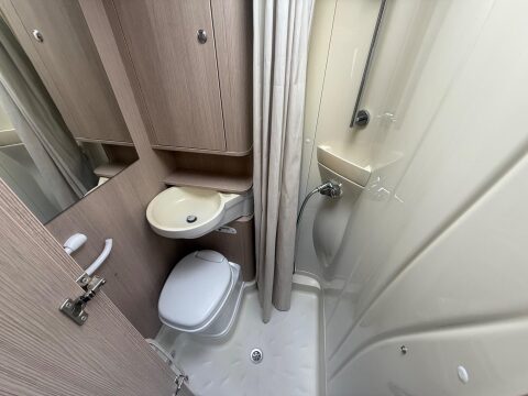 In the bathroom you have a foldaway basin for added space, swivel thetford toilet and large shower tray. Opposite in the kitchen you will find under counter lights, 2 burner hob, sink and 3-way fridge freezer.