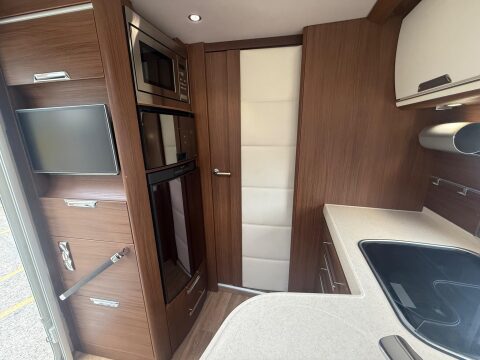 A mid ship kitchen is fully equipped and includes a tech tower with oven, fridge and microwave. The front euro lounge area has twin swivel comfort chairs, climate control, 2 additional travel seats, Led lighting and an extendable table.