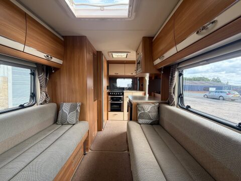 Living - Heating and hot water are provided by an Truma system on gas or electric - TV bracket in lounge - TV Aerial - Electric hook up - 230v and 12v power points - LED spot-lights - Dining table - Awning canopy - Lots of internal and external storage - Window blinds and flyscreens throughout - Loose fit carpets.